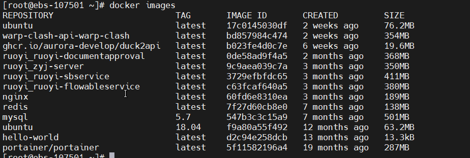 这个命令可以查看本地已下载镜像,如下图会发现有两个一模一样的镜像,标签分别为 18.04 和 latest,镜像 ID 一样。实际上这两个相同 ID,不同标签的镜像,本质就是同一个,只是有不同的名称标签。