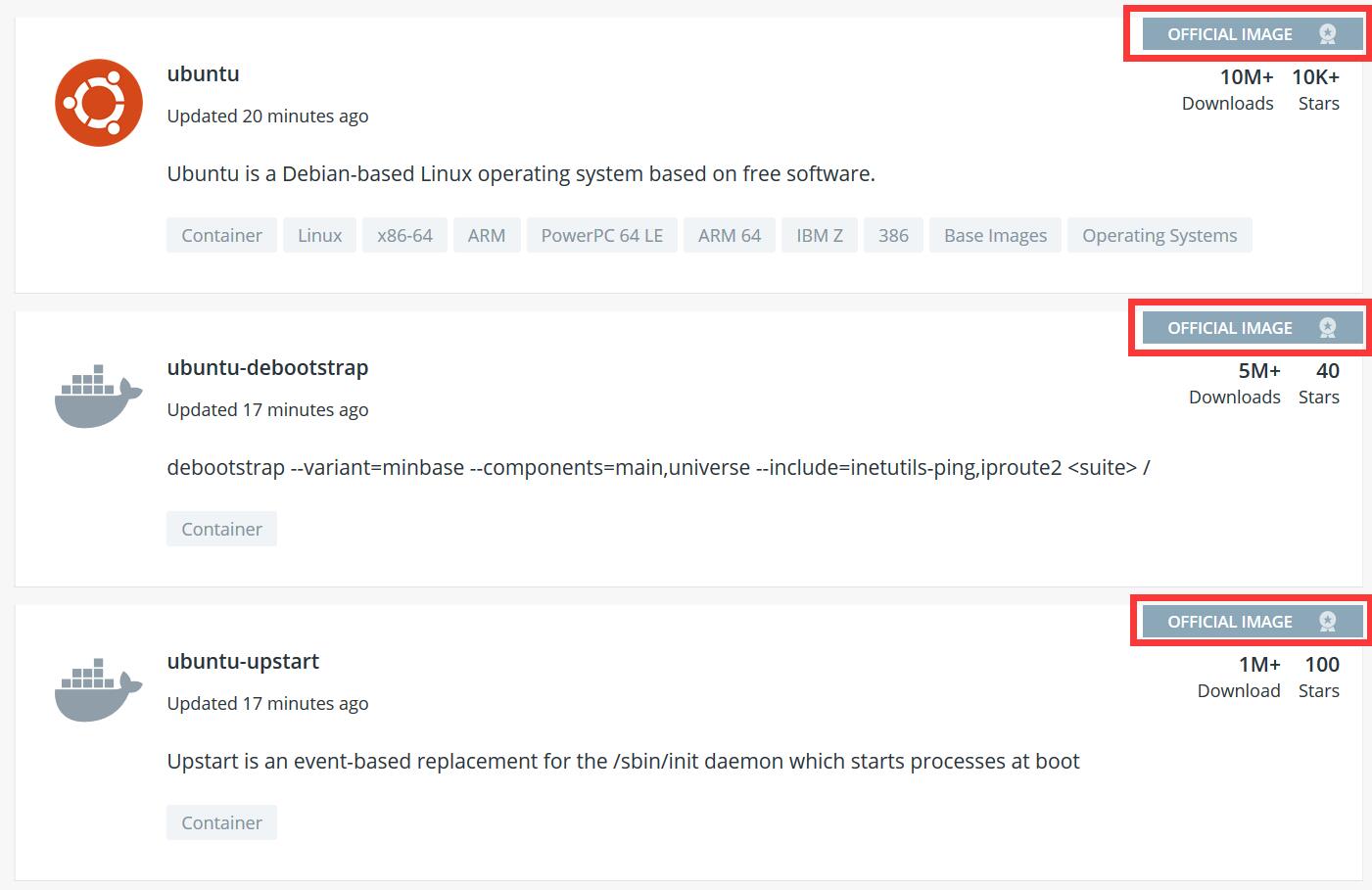 要注意的的是官网仓库的镜像主要分为官方和第三方两种,如下图红框里那种,有官方镜像标识的,那么拉取最新版时可以直接输入镜像名称。